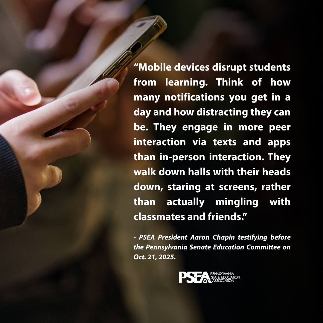 PSEA supports legislation requiring public schools to adopt “bell-to-bell” policies that prohibit students (with limited exceptions) from using their smartphones and other internet-connected mobile devices during the school day, PSEA Vice President Jeff Ney testified before the state House Education and Health Committees.