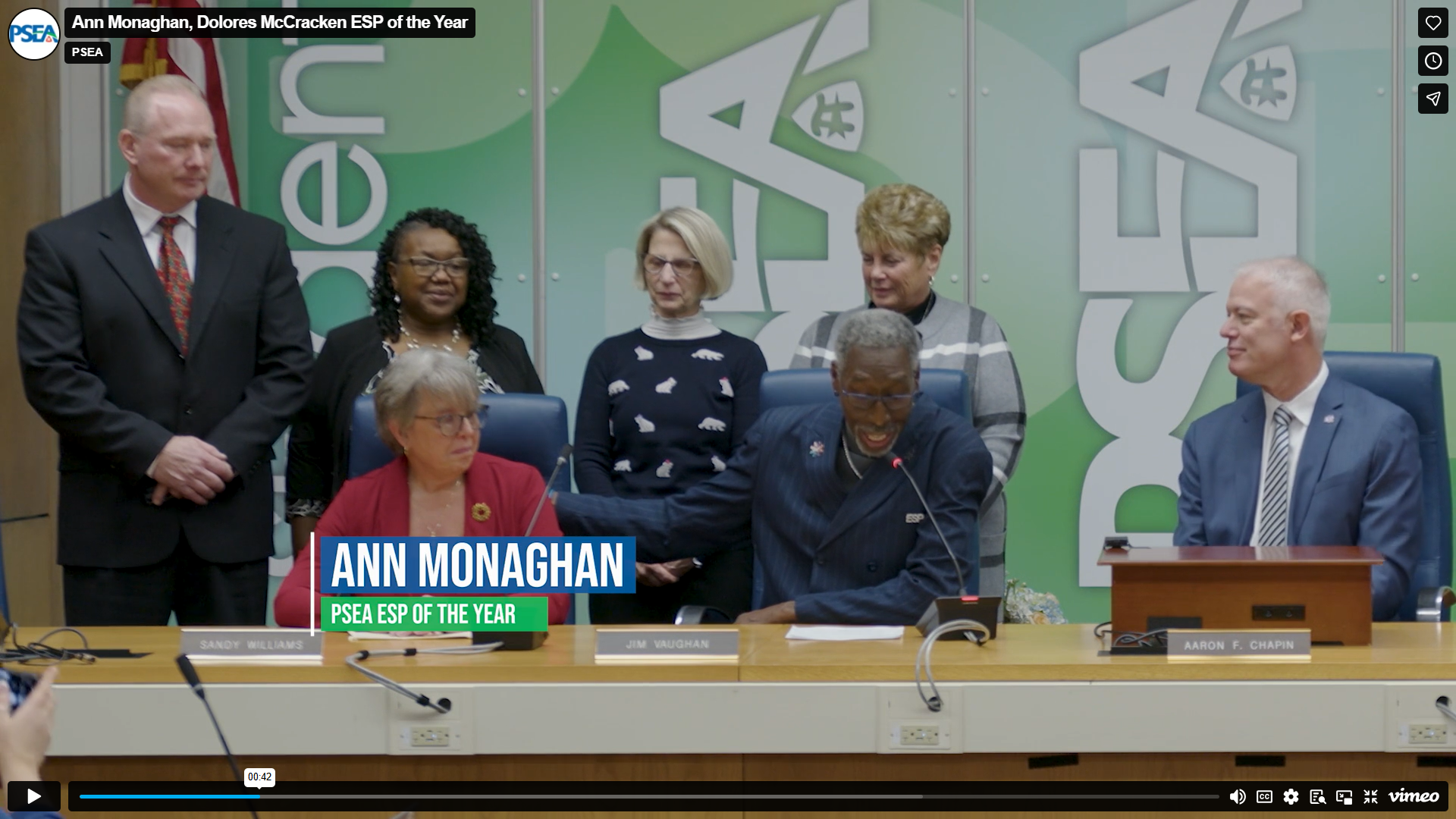 Congratulations to the 2025-26 Dolores McCracken Education Support Professional of the Year Ann Monaghan!Wallenpaupack Area High School administrative assistant Ann Monaghan has been named the PSEA Dolores McCracken Education Support Professional of the Year for 2025-26. The honor was announced during American Education Week. Monaghan has served the district in several roles, including registrar, homeless liaison, and attendance officer. Her work with students experiencing homelessness led to the launch of Hawley Forward, an after-school space that now aims to expand into temporary housing for students in need. She has also served on Hawley Borough Council for 12 years, advocates for a regional homeless shelter, and is a trustee on the PSERS Board. Monaghan is president of her local union and PSEA’s Northeastern ESP Division. Monaghan is now in the running for the National Education Association’s 2026 Education Support Professional of the Year. Click the thumbnail above to watch a video of PSEA leaders presenting Ann Monaghan with her award. |