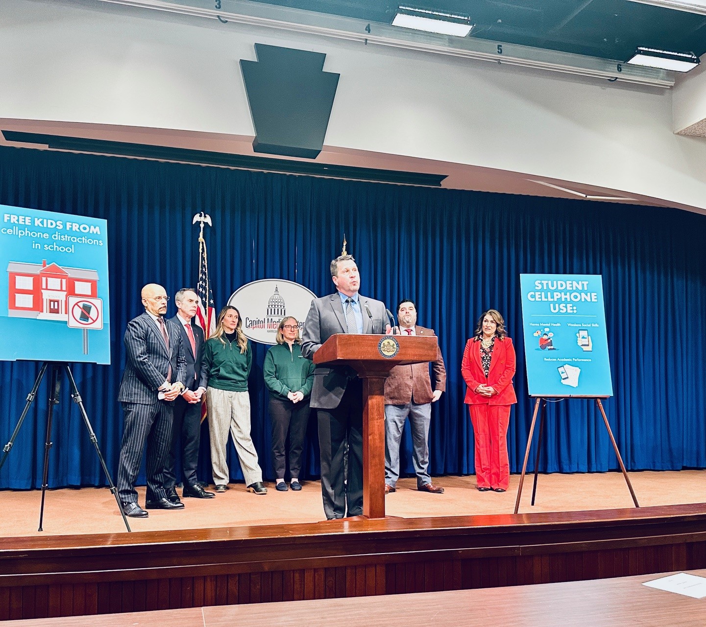 During a press conference on Feb. 4, PSEA Vice President Jeff Ney commended state Sens. Robinson, Santarsiero, and Hughes for leading a bipartisan coalition to restrict student use of mobile devices during the school day. Senate Bill 1014 passed the Senate on Feb. 3 by a vote of 46-1. Here's what it would do: