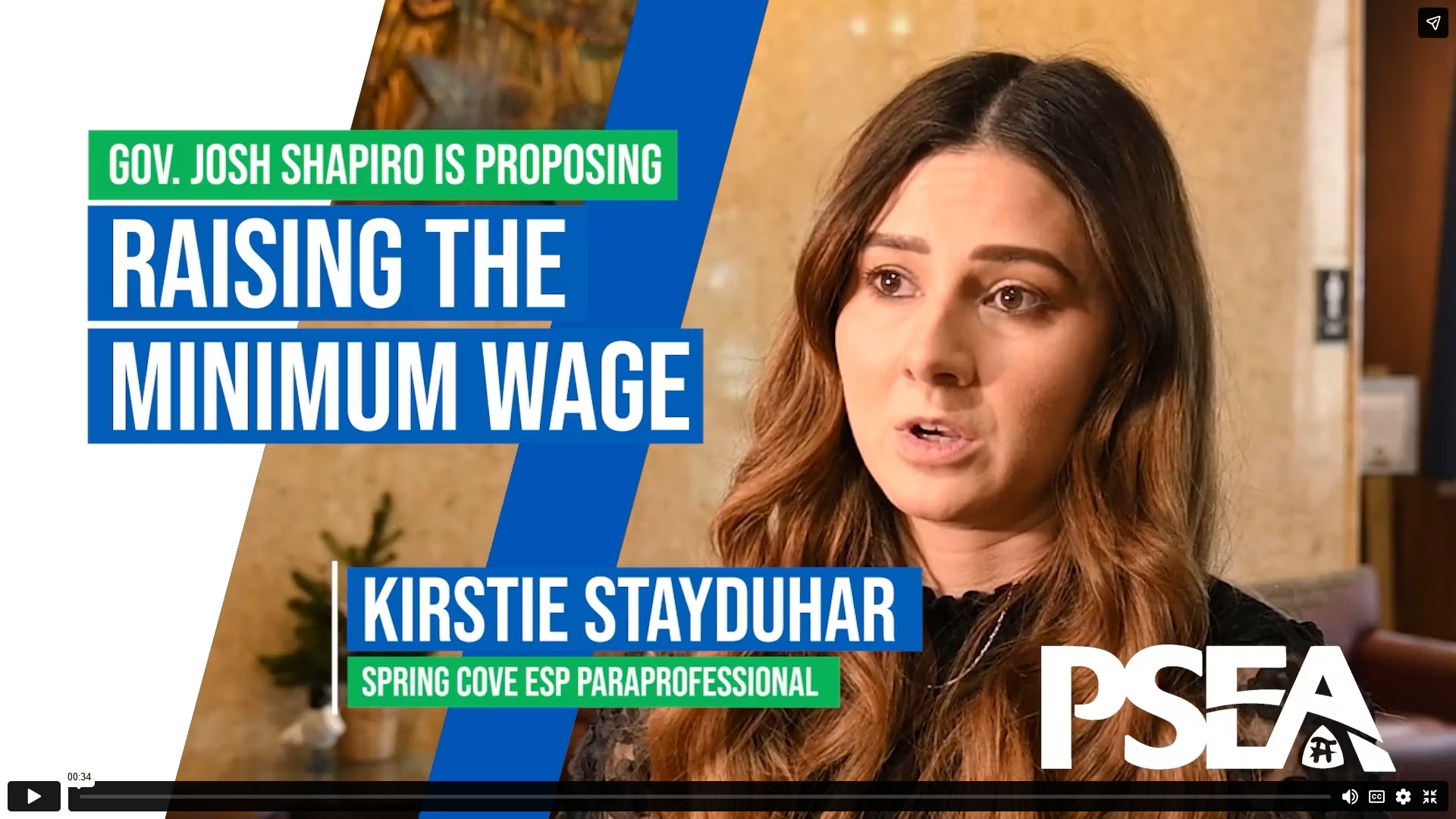 Better wages for education support professionalsOne key point Gov. Shapiro proposed in his budget address is raising Pennsylvania’s minimum wage from $7.25 to $15 an hour, the first increase since 2009. PSEA supports the proposal while we continue to advocate for a living wage of at least $20 an hour for school support staff. Paraprofessional Kirstie Stayduhar of Spring Cove Elementary, who was an invited guest of the governor at his address, said higher wages would help schools recruit and retain staff while allowing employees to better support their families. Click the thumbnail above to see Stayduhar share her thoughts on what raising the wage for support professionals would mean to her. Click the button below to learn more about PSEA’s living wage campaign. |