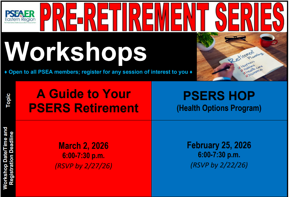This workshop, which focuses on the various membership classes and retirement options available to school retirees through PSERS, will run from 6-7:30 p.m. via Zoom. Pre-registration is required!