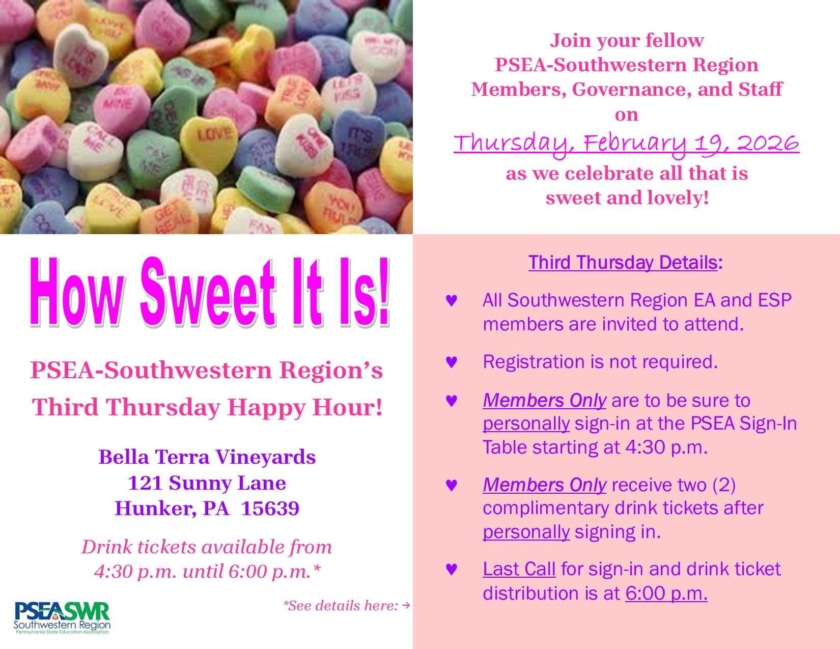 Wear your local association t-shirt or a PSEA Southwestern Region t-shirt to Third Thursdays. Take a photo (individual or group) and email it to Michelle at mstonebraker@psea.org. (Please include the names of all participants in the photo.) Look for your photo on this website.